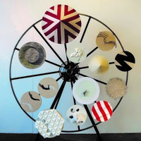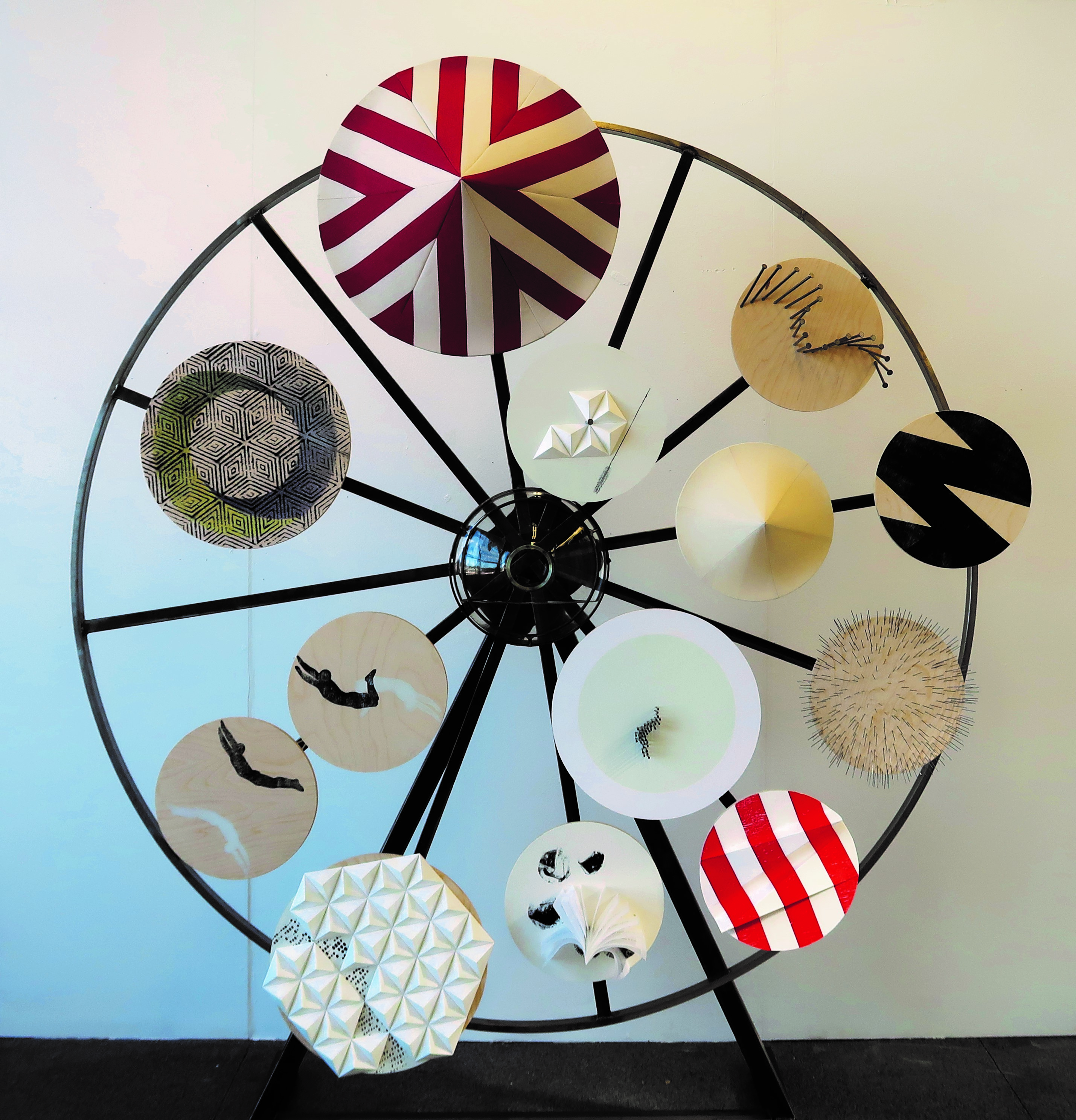 Stalen rad, houten panelen, papier en glas